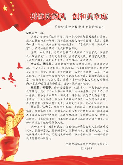 为深入贯彻落实习近平总书记关于家庭、家教、家风建设的一系列重要讲话精神,弘扬中华民族传统美德,倡导清正廉洁家风,近日,吉林化工学院纪委举办了丰富多彩的优良家风主题系列活动。