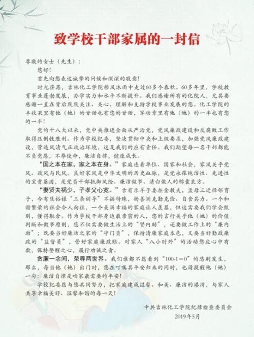 发倡议、寄家信。学院纪委向全校700余名党员和领导干部发放了《树优良家风 创和美家庭》倡议书,向300余位干部家属转交了《致学校干部家属的一封信》,倡导清正廉洁家风,弘扬家庭美德正能量。