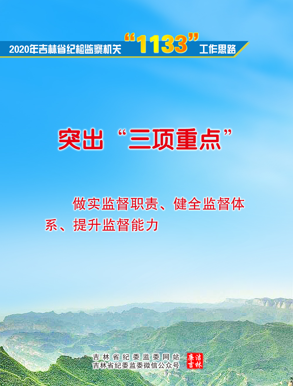为落实好2020年重点任务,省纪委监委新媒体着力打造宣传“两个维护”落实、推动工作、教育干部、引导舆论“四个平台”,推出省纪委十一届五次全会解读系列文章、贯彻落实全会精神“做实监督职责”“健全监督体系”“提升监督能力”等系列稿件,跟进反映全省纪检监察机关贯彻落实全会精神的具体举措、成效,推动吉林纪检监察工作高质量发展。敬请期待。