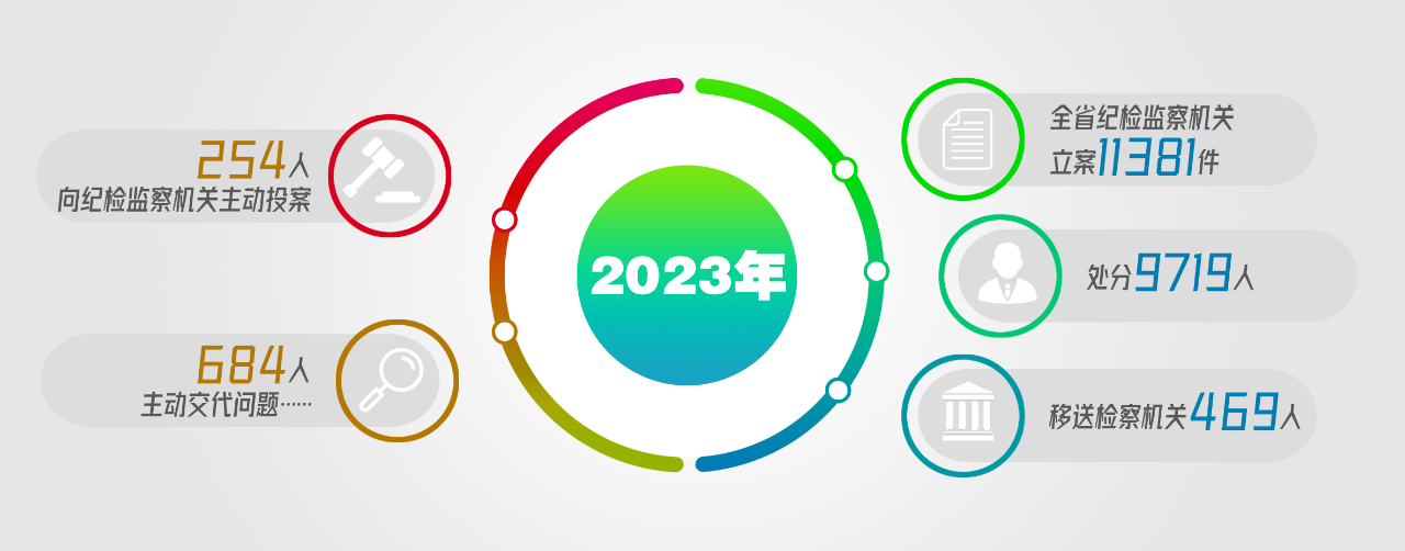2023年,全省纪检监察机关立案11381件、处分9719人、移送检察机关469人。在强大震慑和政策感召下,254人向纪检监察机关主动投案、684人主动交代问题……数字背后,是雷霆之势惩贪治腐的高压震慑,也是靶向发力铁面执纪的具体举措。