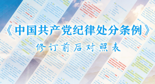 更多>>通知指出,2015年10月中共中央印发的《中国共产党纪律处分条例》,对维护党章和其他党内法规、严肃党的纪律、坚持从严管党治党发挥了重要作用。党的十九大将纪律建设纳入新时代党的建设总体布局,在党章中充实完善了纪律建设相关...